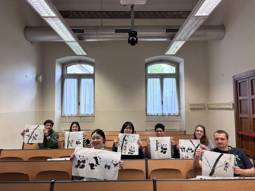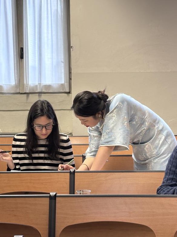 在本次活动中,中国国画这一承载千年历史的艺术形式走进了意大利米兰圣心大学的校园。对许多学生而言,这是他们首次亲身体验笔墨纸砚等中国传统书画工具。在学习基本书画技法的同时,他们也切身感受到了笔墨之间所蕴含的意象之美。学生们手握毛笔,在宣纸上描绘出属于自己的“东方印象”,一笔一划之间,勾勒出对中国艺术的热爱与敬意。