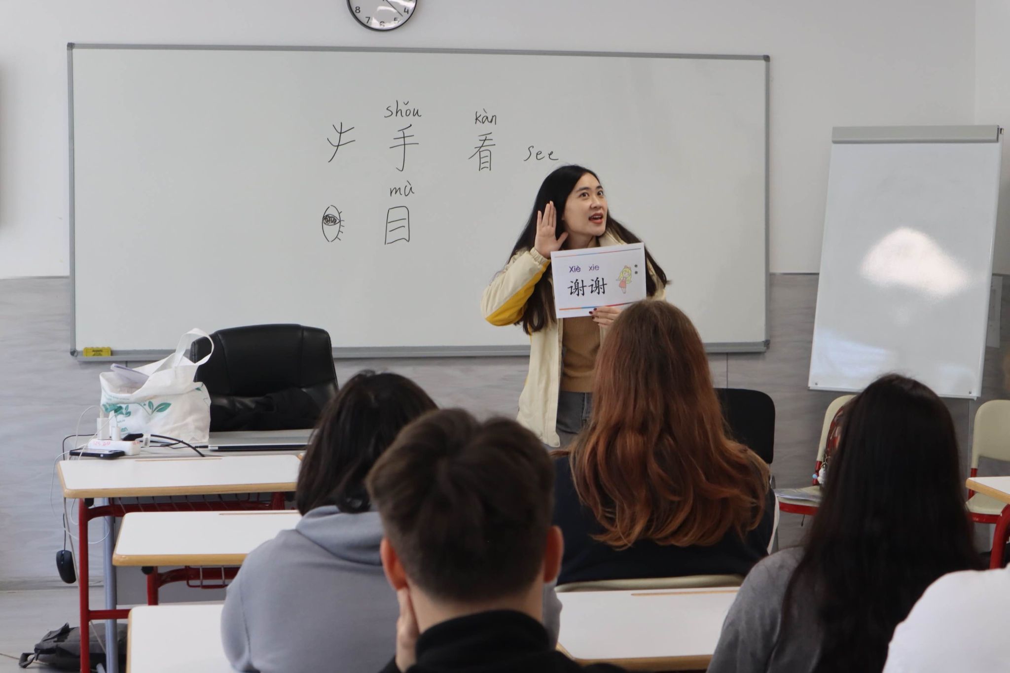 三位中文教师也分别从文化、汉字、语言三个角度进行了一场场别开生面的教学展示。吕文菲老师以长城、熊猫和茶艺等文化符号为切入点,解析其中蕴含的东方智慧,并邀请学生到孔子课堂参与太极拳和书法体验。然后,贾伟老师通过“手”“目”“看”的象形文字演变,展现汉字“画中有意”的特质,学生们在互动中领悟汉字的魅力。徐玉锦老师设计手势互动游戏,学生迅速掌握“你好”“谢谢”“再见”等实用表达,课堂氛围热烈欢快。