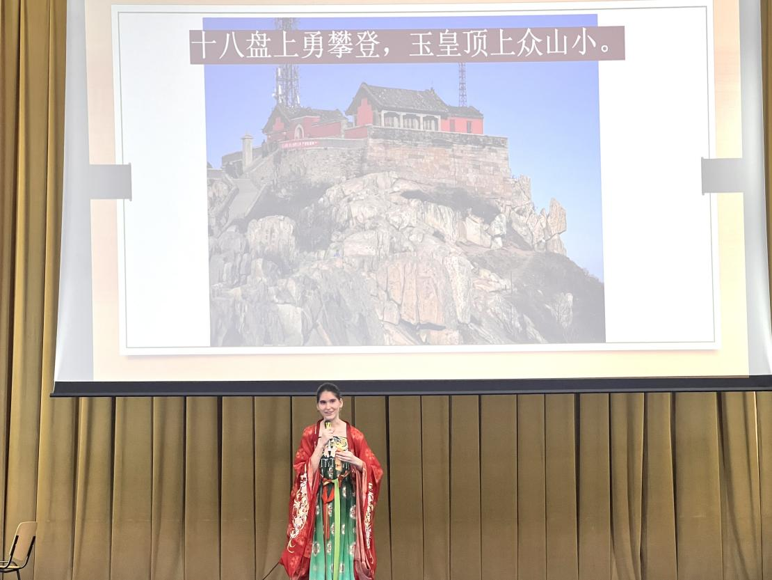 本届比赛中,锡比乌孔子学院的选手Vulturar Natalia(中文名:蓝月亮)以出色的表现摘得特等奖(第一名),并获得了被推荐赴华参加世界中学生“汉语桥”总决赛的资格。在演讲《乘风破浪,与汉语同行》中,蓝月亮用流畅的语言、清晰的发音和真挚的情感,讲述了自己学习中文的历程与梦想,深深打动了现场评委与观众。才艺展示环节,她以中国古典舞《上春山》搭配古诗朗诵《村居》,形式新颖,内容衔接自然,展现了深厚的文化理解力与艺术表现力,赢得了现场观众的热烈掌声。值得一提的是,蓝月亮的舞蹈表演在杨紫彤老师的协助下得以精心打磨,从动作设计到节奏衔接,均展现出专业与美感,为整场表演增添亮点。