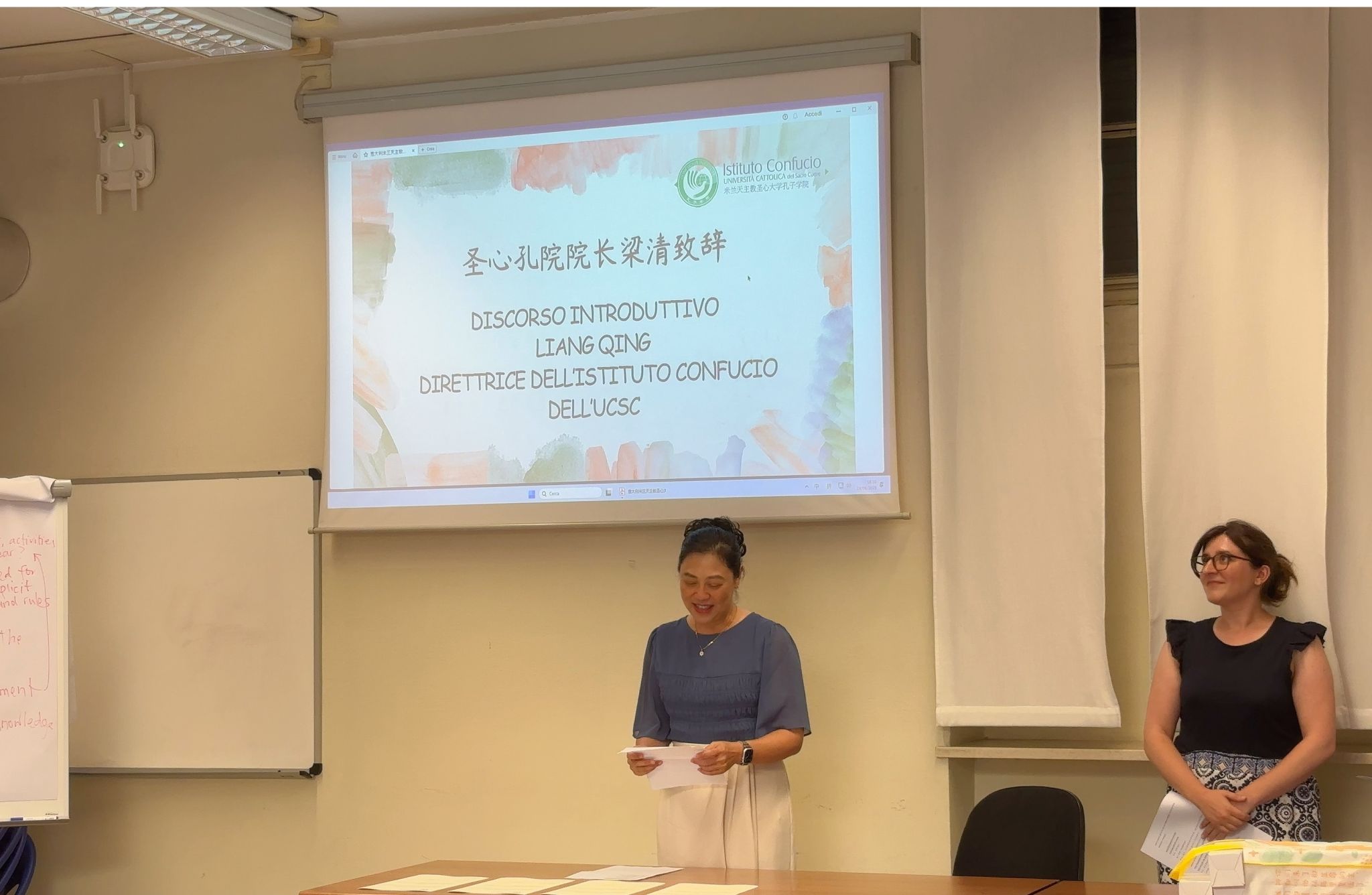 下午六点一刻,结业典礼正式拉开帷幕,由圣心孔院公派教师刁江智和意方秘书白亚莎(Beretta Alessandra)共同主持。中方院长梁清教授用意大利语致辞,她向顺利完成学业的学员们表示热烈祝贺,高度肯定了大家在中文学习中展现出的进步与热情,并鼓励大家继续深入学习汉语,感受中华语言之美,理解中华文化之深。同时,梁院长也热情欢迎学员们在未来继续回到圣心孔院学习交流。