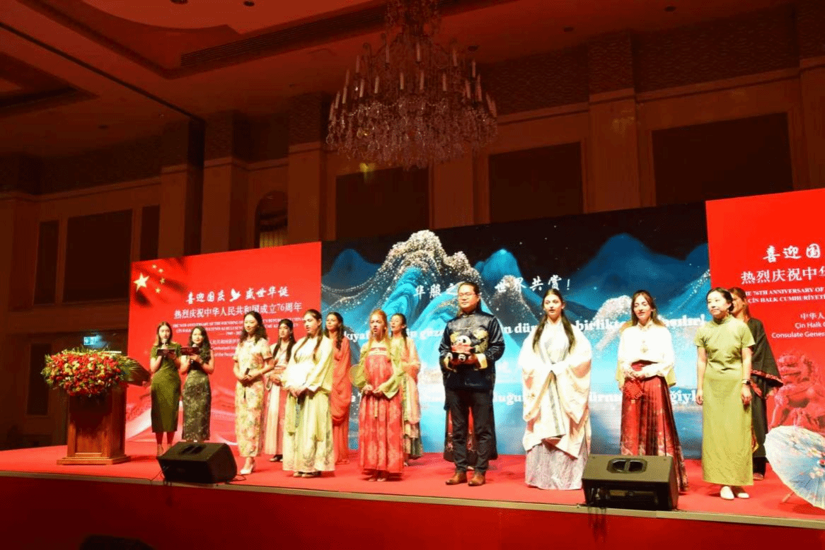 文艺演出伊始,奥坎大学孔子学院师生表演的《中华传统服饰秀》惊艳亮相。十几名土耳其学生和孔院教师身着精心准备的中国汉、唐、宋、明等不同朝代的传统服饰,在悠扬的古乐中徐徐登场。他们仪态端庄,神情自信,不仅展现了华夏衣冠的典雅华美与变迁历程,更以跨越文化的表达赢得了现场嘉宾的阵阵掌声。这场视觉盛宴不仅是一场展示,更是一次文化的对话,让在场观众仿佛穿越时空,感受到中华文明的厚重与璀璨。