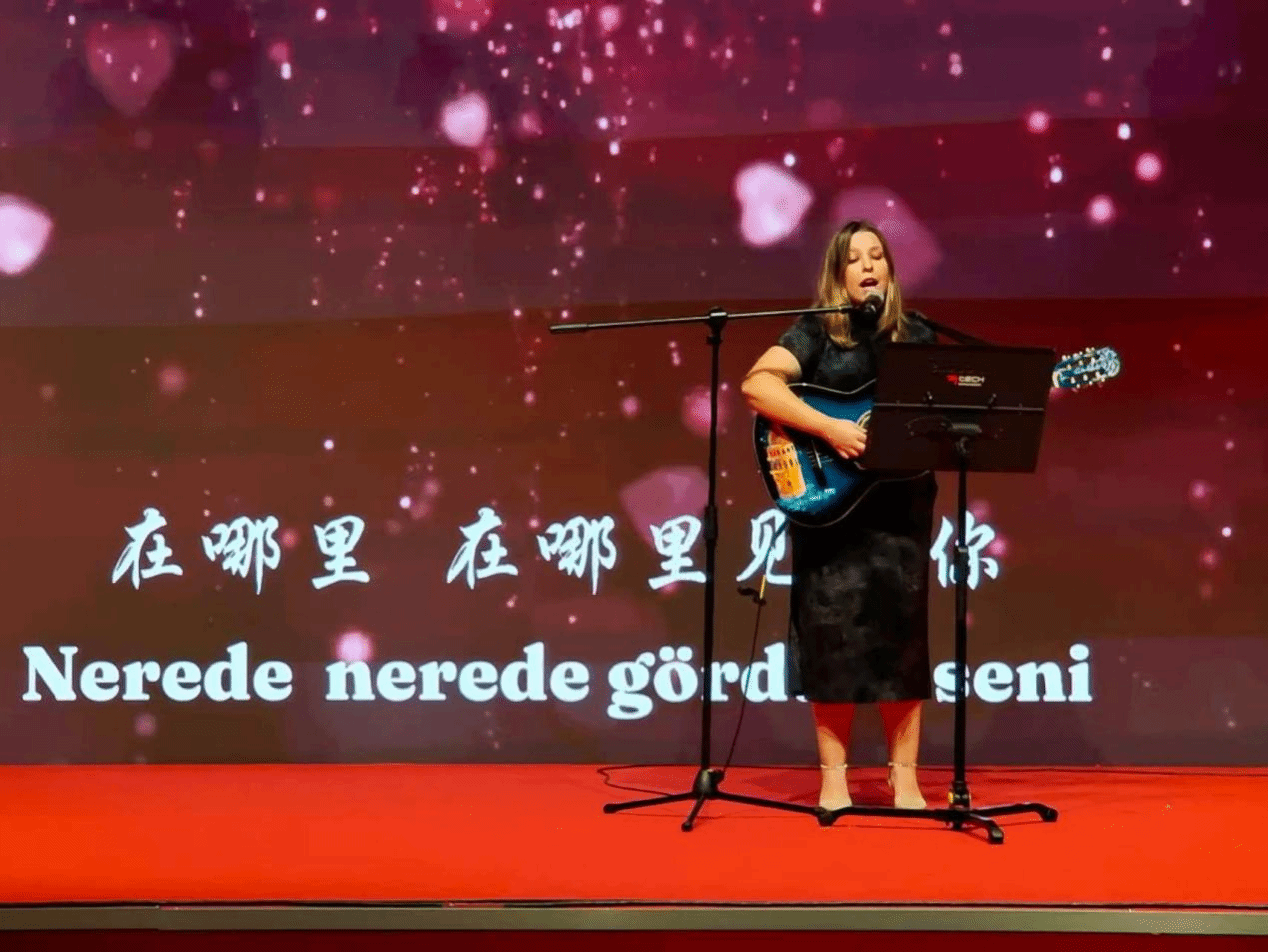 孔院学员Çağla Selin Acar(青果)的吉他弹唱亦令人难忘。她以流畅的中文深情演绎中国民歌《茉莉花》和流行金曲《甜蜜蜜》,清新动人的歌声与真挚的情感打动了全场听众,展示了土耳其青年对中国文化的理解与热爱。