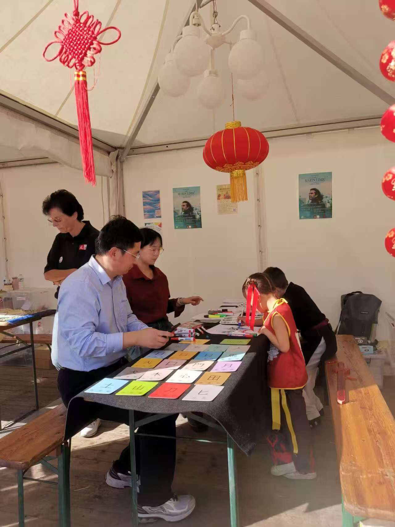 波恩孔院为本次中国节开幕日准备了多个互动活动,旨在吸引市民近距离感受中国文化。在知识问答环节,孔院教师特别设计了“生肖转盘”有奖问答活动。参与者转动转盘后,随机获得一个生肖图案及对应的问题,再根据回答的正确与否赢取不同的纪念品。奖品均带有中国元素,深受参与者欢迎。现场还会对题目进行补充讲解,让参与者对生肖文化和中国相关知识有更深入的了解。波恩孔院还准备了“汉字猜猜看”活动,现场引导参与者通过卡片认识汉字的结构,理解文字与意义之间的联系。许多参与者在讲解中第一次体会到汉字独特的造字逻辑,表现出浓厚的兴趣。另外一项活动为“画脸谱”,老师们不仅准备了彩色画笔和脸谱底稿,还特意为小朋友们讲解了脸谱中不同颜色所代表的性格与角色,并引导小朋友们亲手上色。