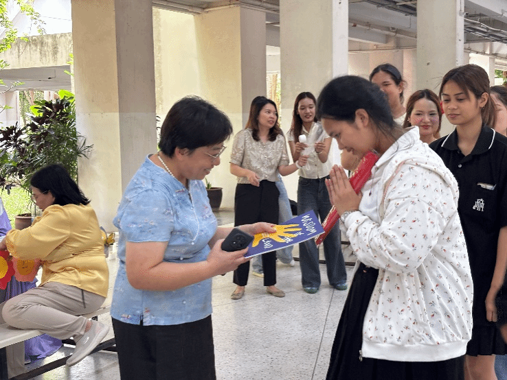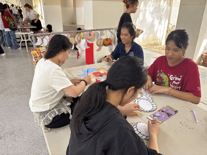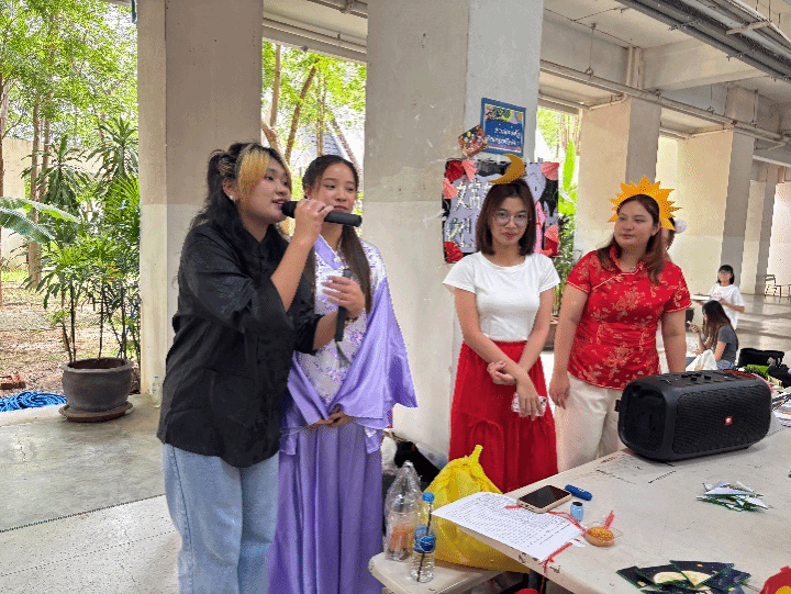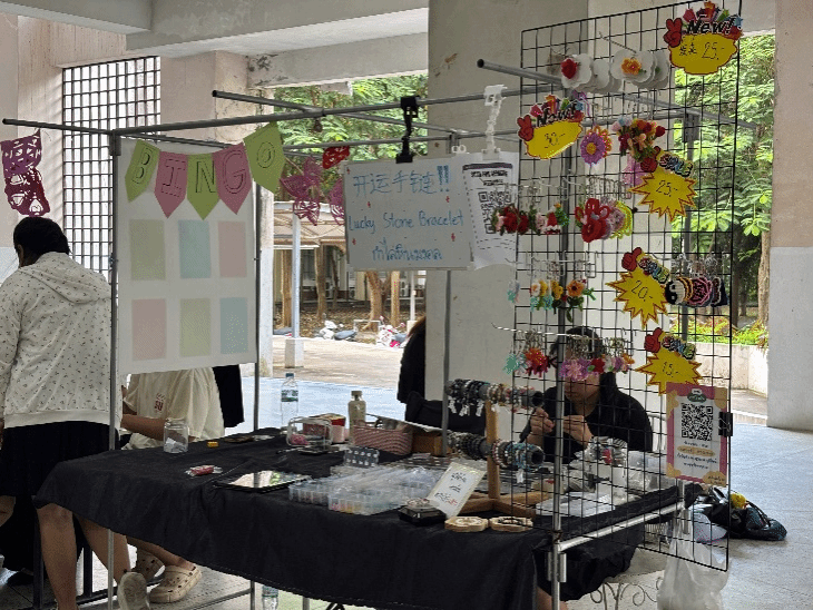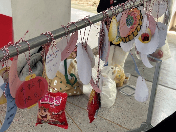 活动现场气氛热烈,学生展台布置精巧,洋溢着浓厚的中秋文化氛围。活动内容丰富多彩,包括“嫦娥奔月”故事讲述、汉字翻翻乐、月饼心愿绘制以及开运手链制作等。学生们积极参与、热情互动,不仅展示出扎实的汉语功底,更体现了他们对中国传统文化的浓厚兴趣和对中泰文化融合的独到理解。