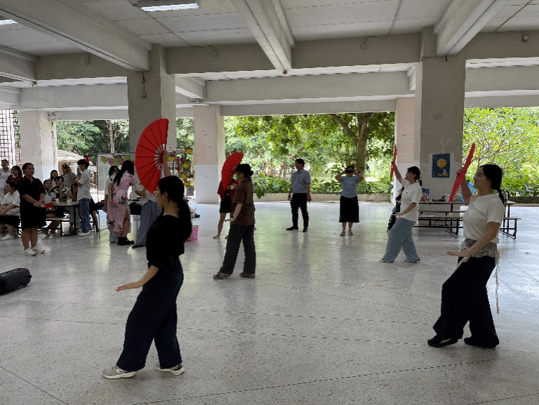 孔子学院志愿者还进行了精彩的太极功夫扇表演,并进行现场教学,在场学生纷纷加入体验,将现场气氛推向高潮。