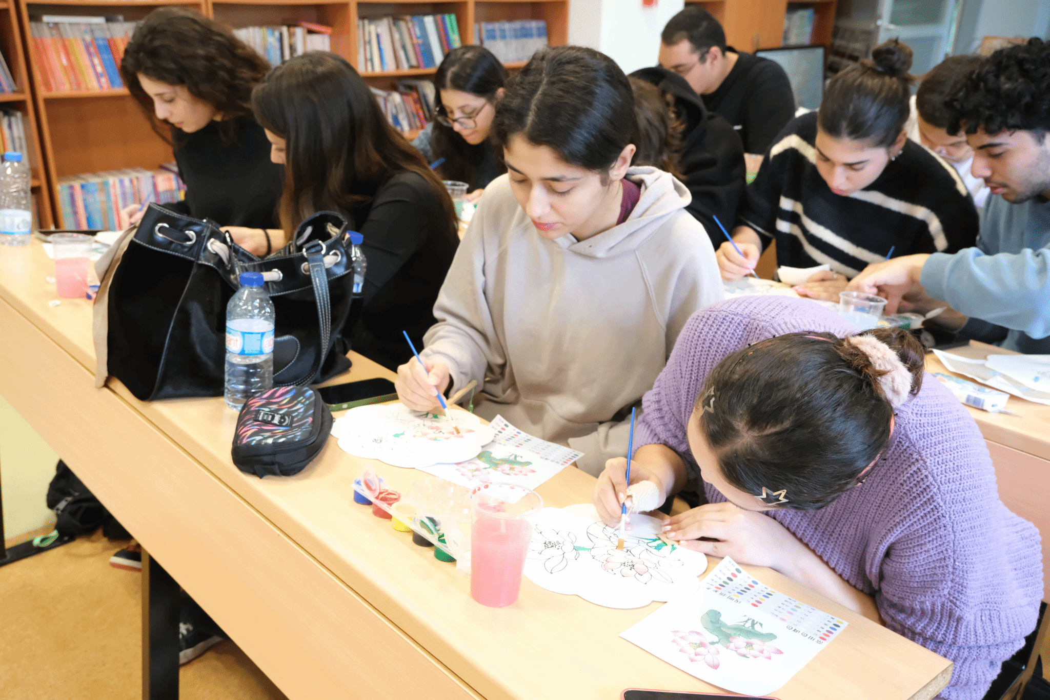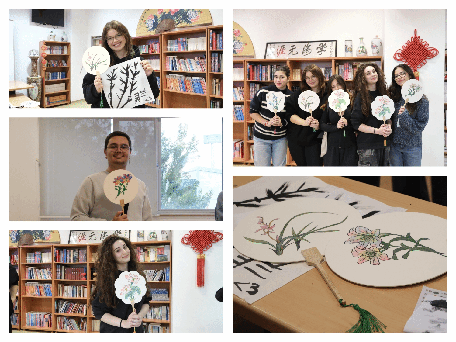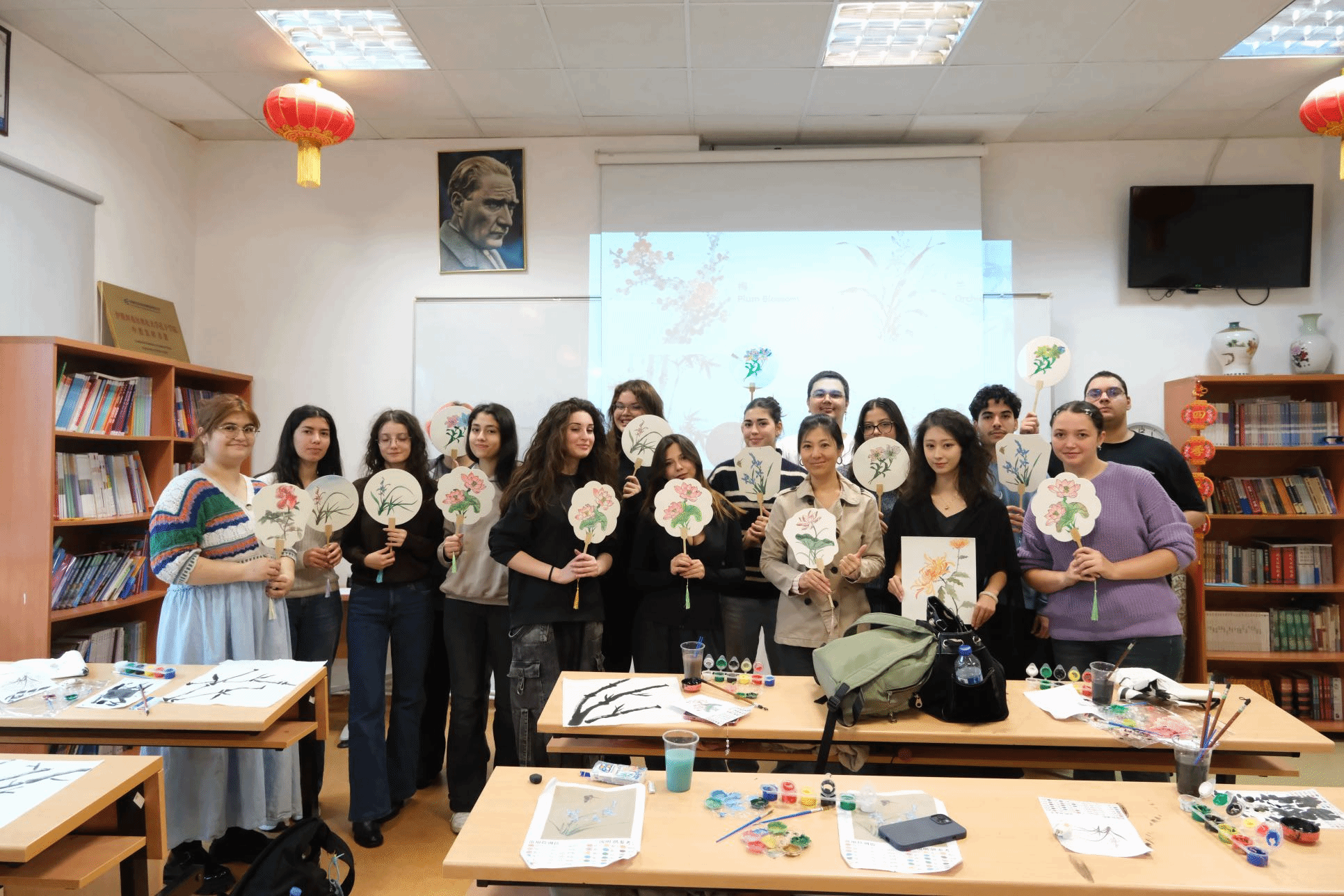 扇面创作环节将现场气氛推向高潮。孔院为每位参与者准备了空白折扇,大家各展创意:有人延续“四君子”主题,力求还原传统韵味;有人融入土耳其传统色彩纹样,让两种文化碰撞出奇妙火花,教室里墨香阵阵。完成创作后,师生们互相欣赏作品、拍照留念,手中的折扇成为此次文化体验的珍贵纪念。