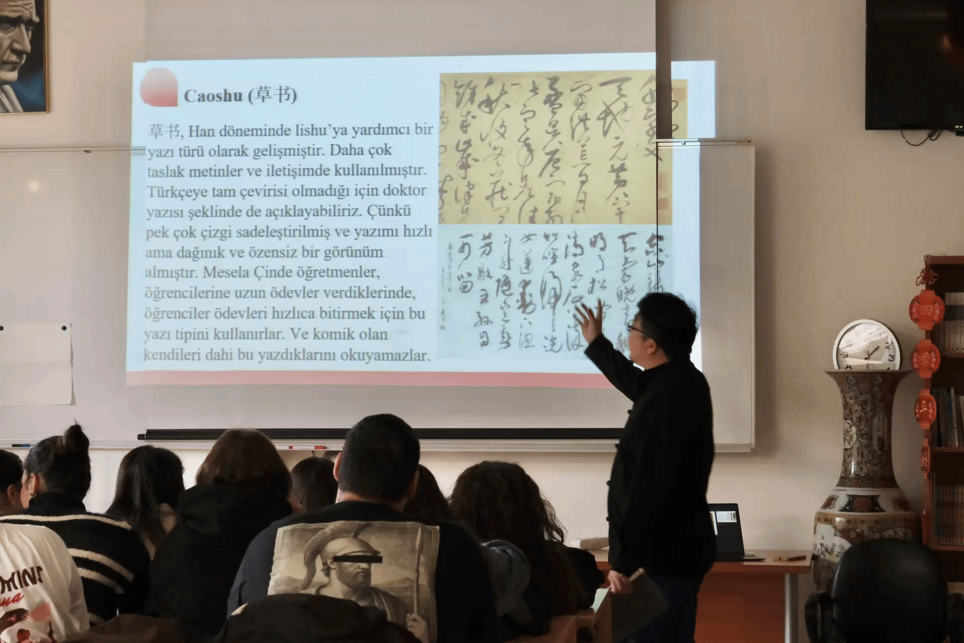 课程伊始,赵兆老师以流畅的土耳其语,为师生们讲述了汉字的千年演变史。从甲骨文的“象形密码”,到金文的厚重、篆书的规整、隶书的转折与楷书的端庄,清晰展现汉字从“画”到“写”的发展轨迹。通过“日”“月”“山”等汉字的演变示例,赵老师生动诠释了汉字“形义结合”的独特魅力,帮助师生跨越语言隔阂,触摸中国文字的深厚底蕴。