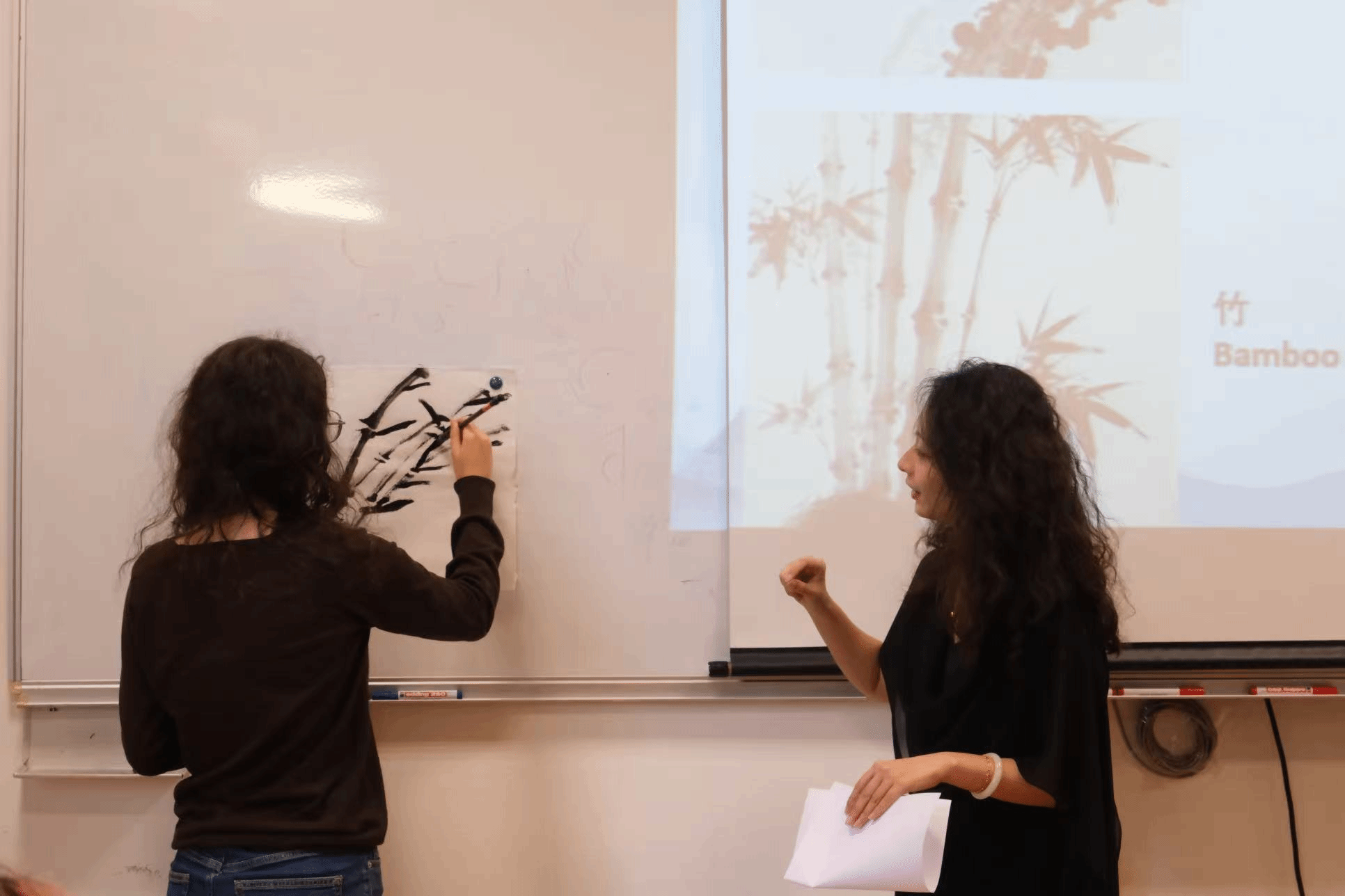 随后,李依婷老师带领大家走进传统水墨画世界,聚焦“花中四君子”梅兰竹菊。她一边讲解绘画技巧,一边在宣纸上示范,墨汁在其笔下焕发生机,寥寥数笔便勾勒出梅兰竹菊的清雅风骨。示范后,李老师邀请同学们尝试,耐心指导握笔姿势与水墨浓度,鼓励大家大胆创作,让初次接触水墨画的同学也能渐入佳境。