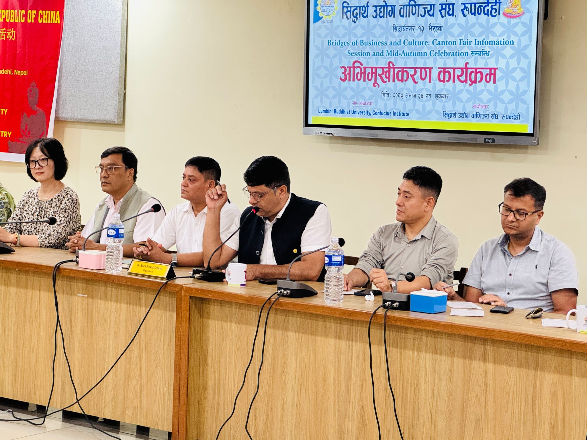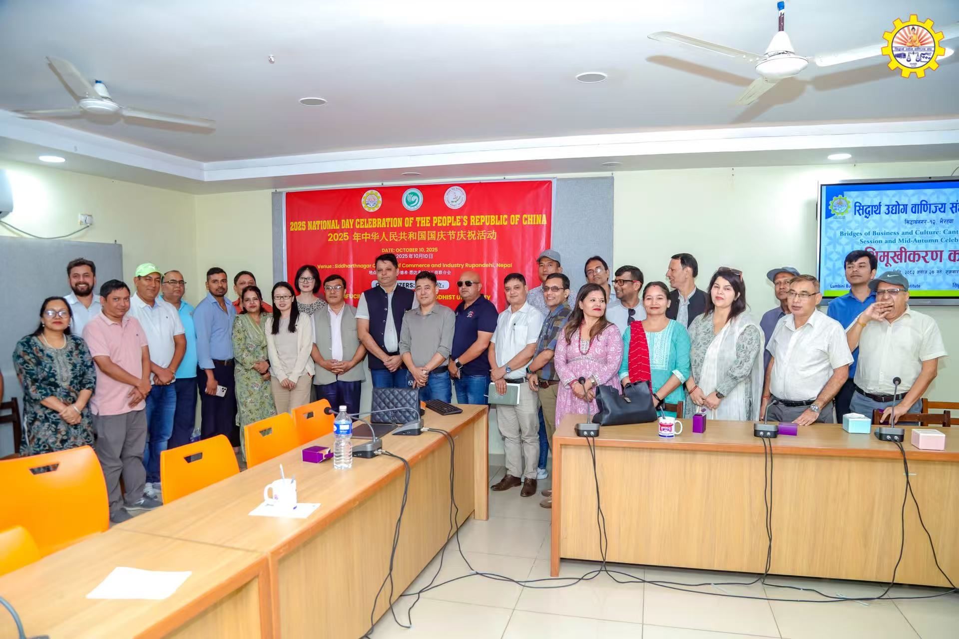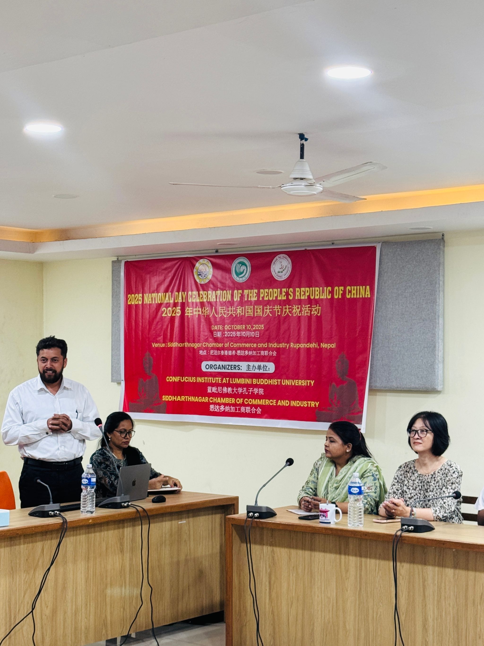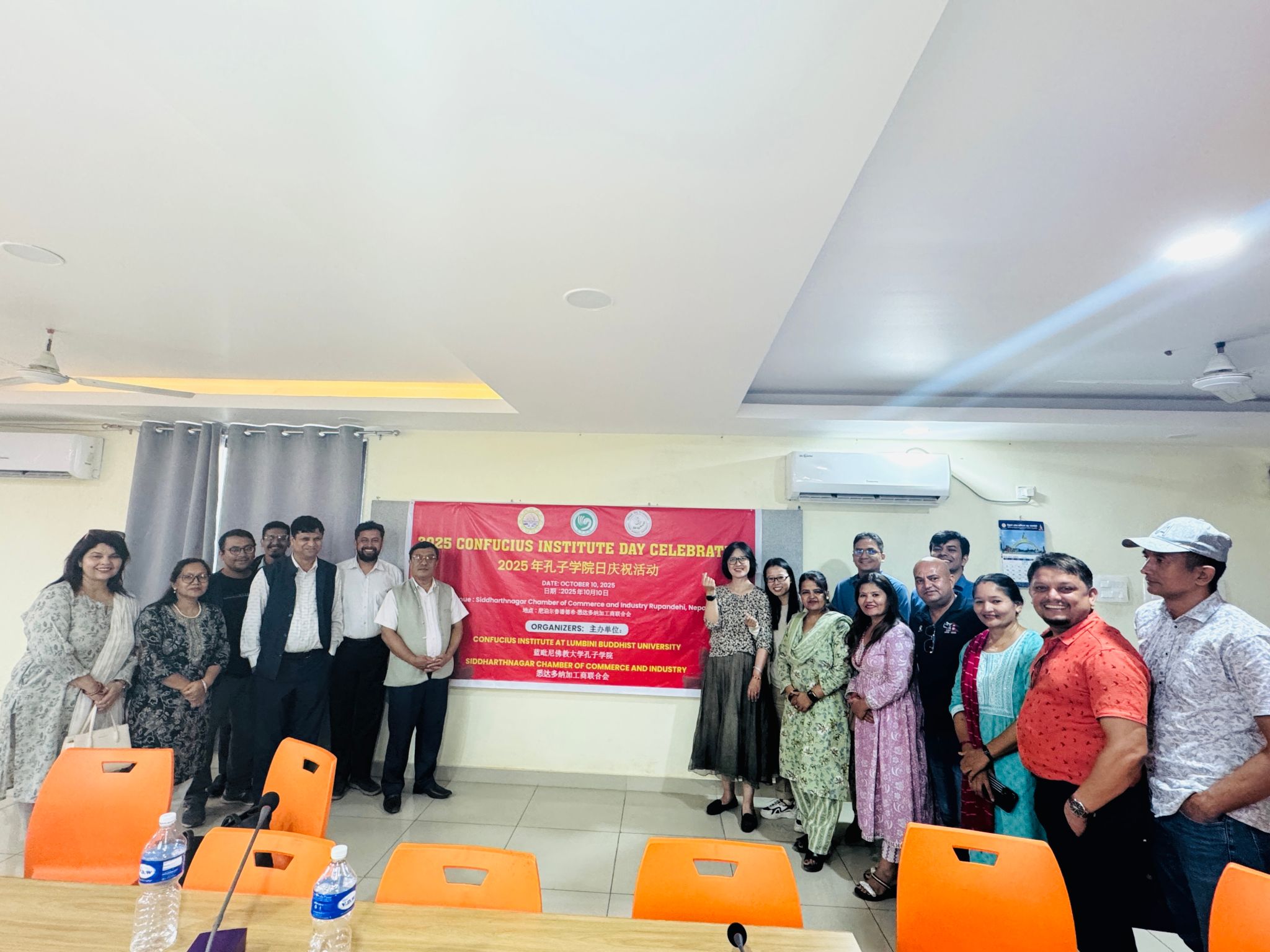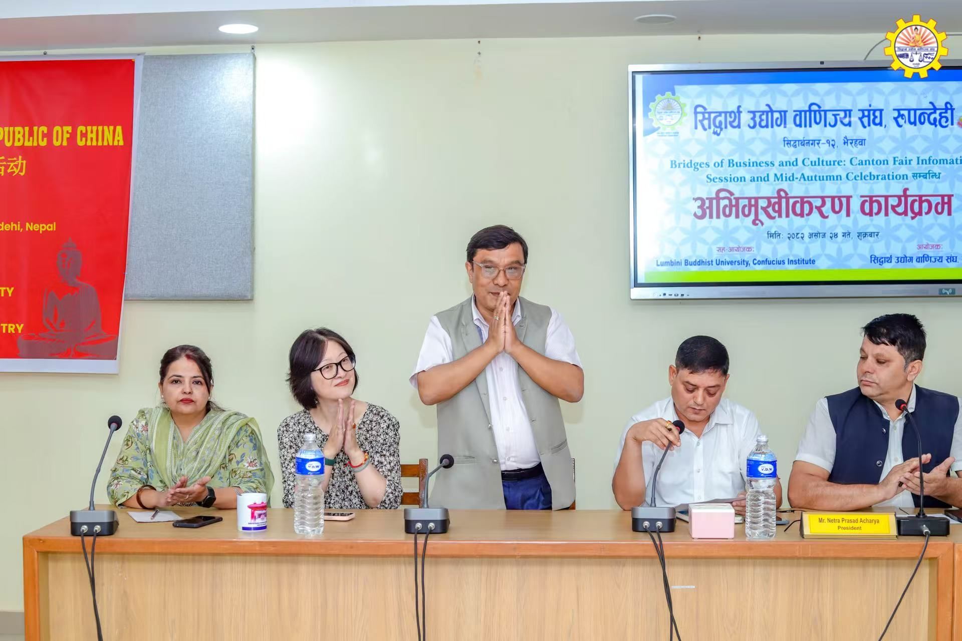 以团圆为主题,在尼泊尔假期结束后的第二个工作日,10月10日,在尼泊尔鲁潘德希·悉达多纳加工商联合会的大会议室,蓝毗尼佛教大学孔子学院与悉达多纳加工商联合会共同举办了热烈的庆祝活动。此次庆祝活动涉及多个主题:庆祝孔子学院日、庆祝中华人民共和国成立76周年、庆祝中秋节、中国广交会推介。