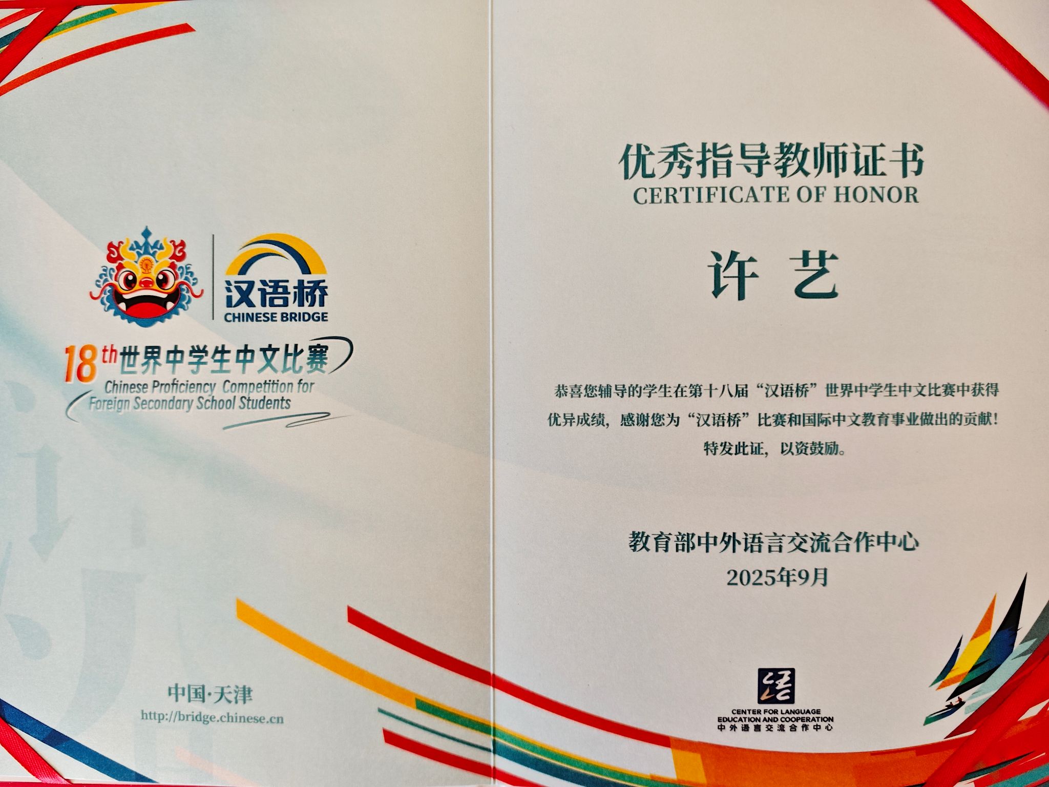 作为一名经验丰富的国际中文教师,许艺老师长期致力于中文教学与比赛辅导,已积累了系统而高效的教学方法。她曾于2019年辅导学生伊丽莎白荣获“汉语桥”世界中学生中文比赛一等奖,并于2020年辅导学生罗德获得二等奖。此次,她再次通过精准辅导和因材施教的方式,帮助马思煜在全球性比赛中脱颖而出。
