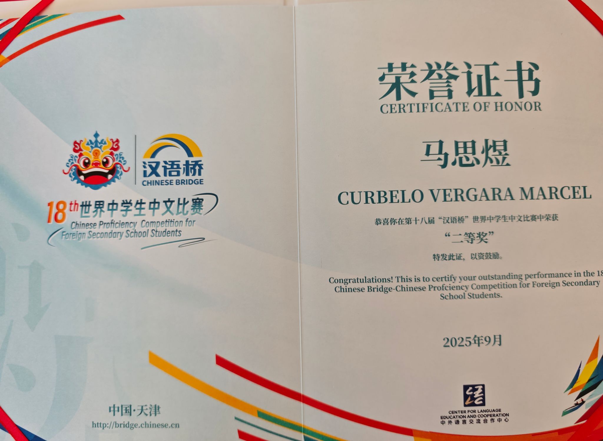 北语新闻网10月22日电(通讯员 许艺 摄影 许艺)在近日圆满落幕的第十八届“汉语桥”世界中学生中文比赛中,哈瓦那大学孔子学院学生马思煜凭借出色的中文水平与综合表现荣获全球二等奖。与此同时,其指导教师许艺因在辅导过程中表现卓越,荣获比赛的“优秀指导教师”称号。这是许艺老师近年来第三次辅导学生在“汉语桥”比赛中获奖,充分彰显了她的教学实力和专业素养。