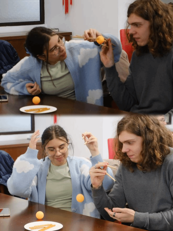 在讲解过程中,王皓滢老师邀请同学们现场练习使用筷子。原本信心满满的大家,一旦动手便状况百出——有的同学夹得手忙脚乱,乒乓球总是不听话地滚走;有的则小心翼翼地“对准目标”,结果夹到一半笑场;还有同学把筷子握成了“笔”。学生们互相打趣、相互鼓励,从最初的笨拙到逐渐熟练,在欢乐中真正体会到了筷子的精巧与趣味。一位学生笑着说:“用筷子也是门技术!”