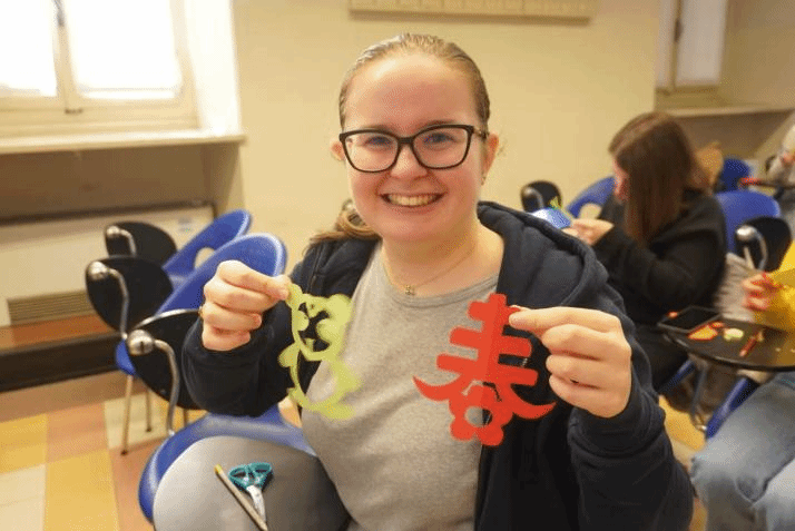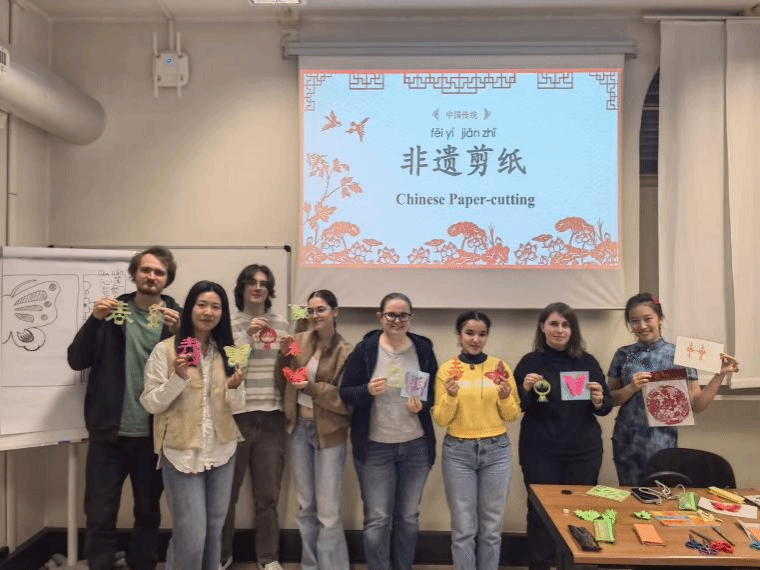 在自由创作环节,学生们充分发挥想象力,剪出了花朵、星星、心形等各式图案。剪刀游走纸间,不仅剪出了艺术的巧思,也传递了跨文化交流的温度。一位学生感慨道:“通过剪纸,我感受到了中国文化的细腻与温暖,也体会到了动手创作的快乐。”