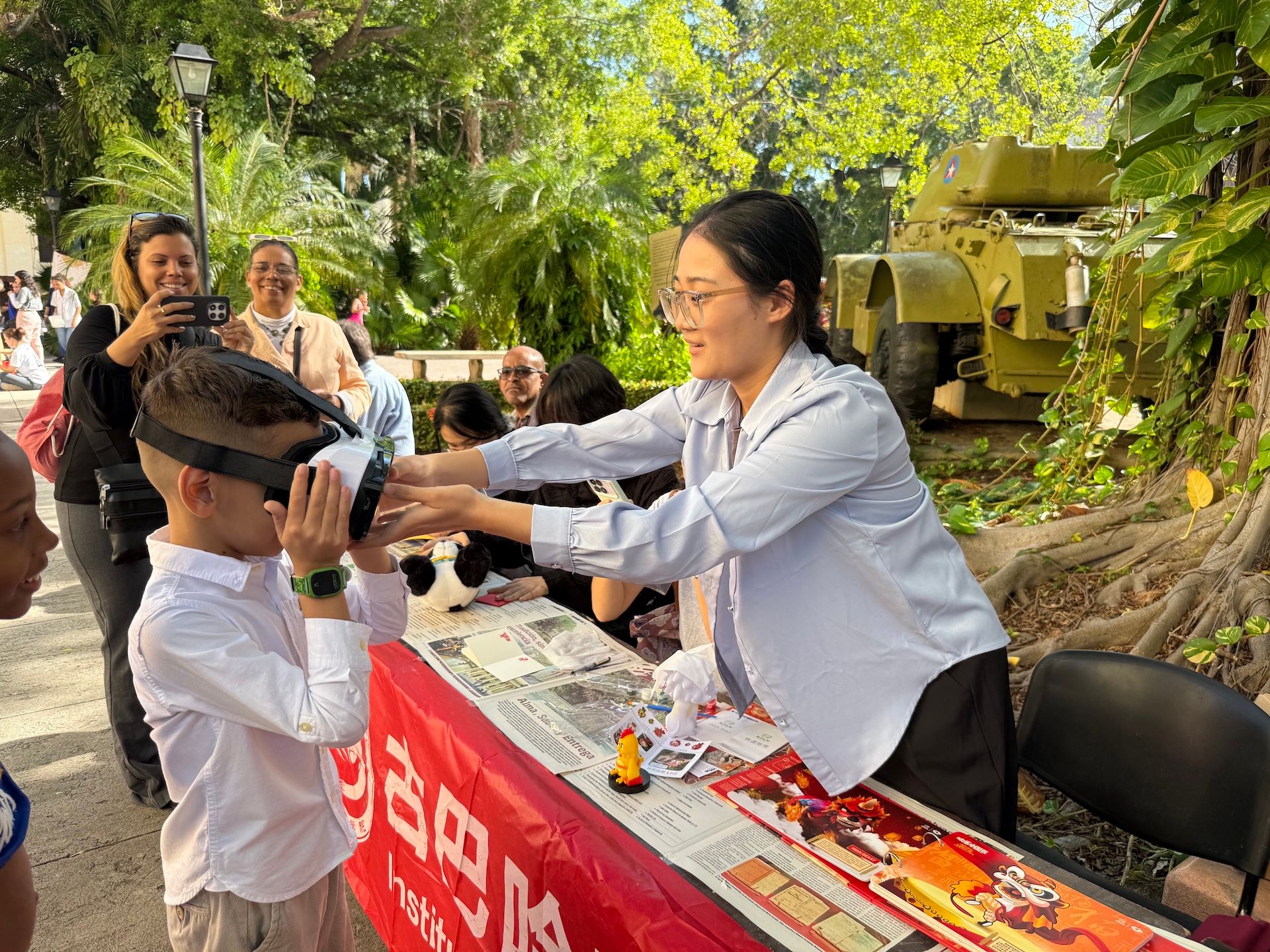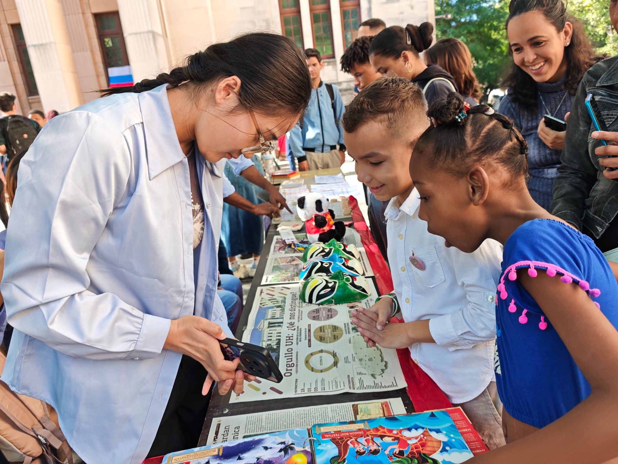 在科学节活动中,哈瓦那大学孔子学院设立了以“科技与文化相遇”为主题的特色展区。展区内容结合了数字技术与文化互动,展示了中国文化与科学思维融合的独特魅力,吸引了大量参观者的兴趣和参与。