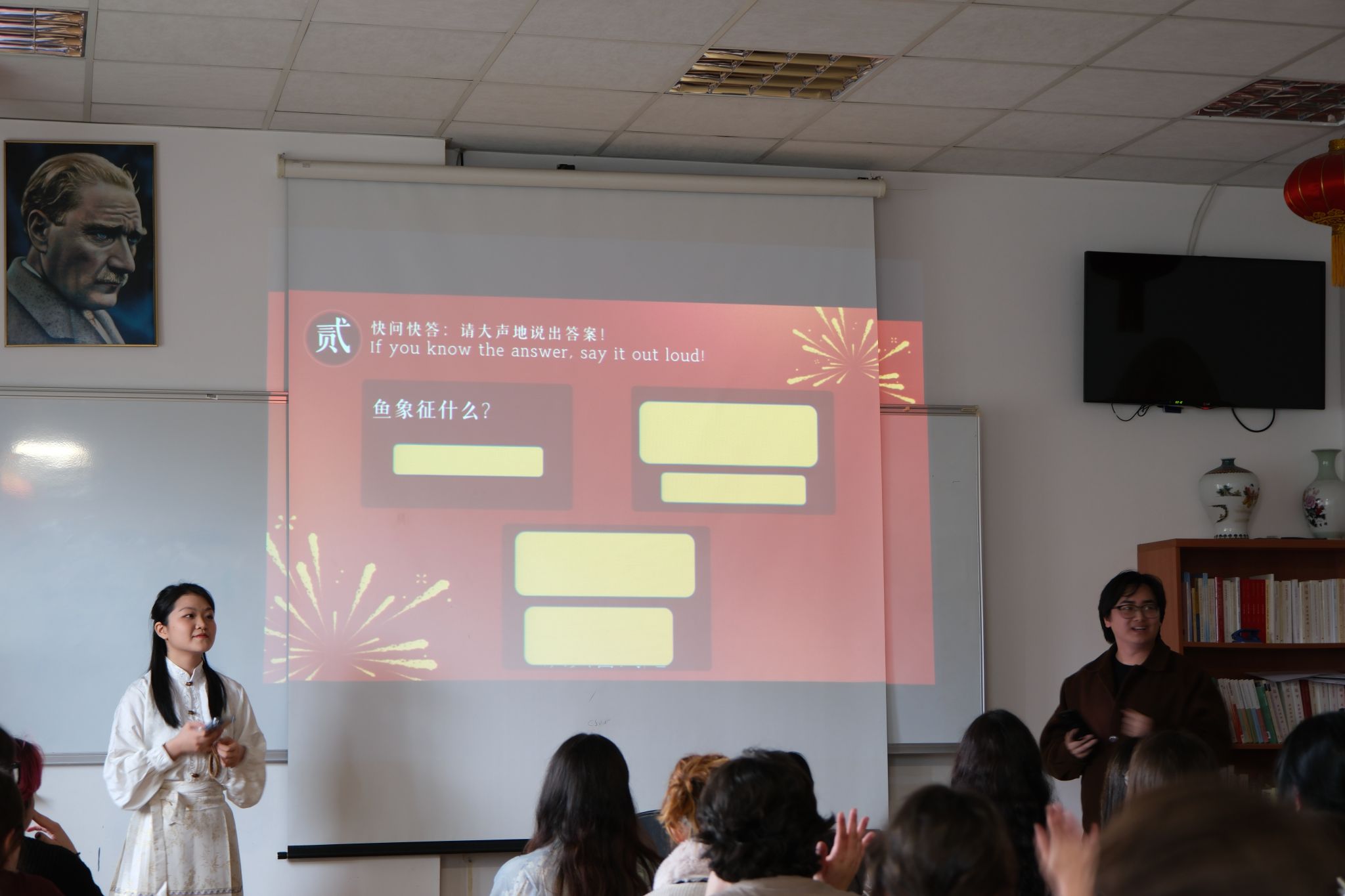 文化讲解刚落幕,活动便进入了气氛热烈的‘快问快答’环节。孔子学院教师围绕刚刚讲过的鱼灯知识,准备了一系列趣味问题,考验大家的‘听课成果’。“鱼在中国文化中象征什么?”“为什么中国人年夜饭上常出现鱼?”“鱼灯最常见的是什么配色?”问题一出,台下学生们争先恐后地举手,现场气氛瞬间被点燃。答对的同学收获了精美的中国文化主题礼品,欢声笑语中,鱼灯的知识也在不知不觉间深入人心。