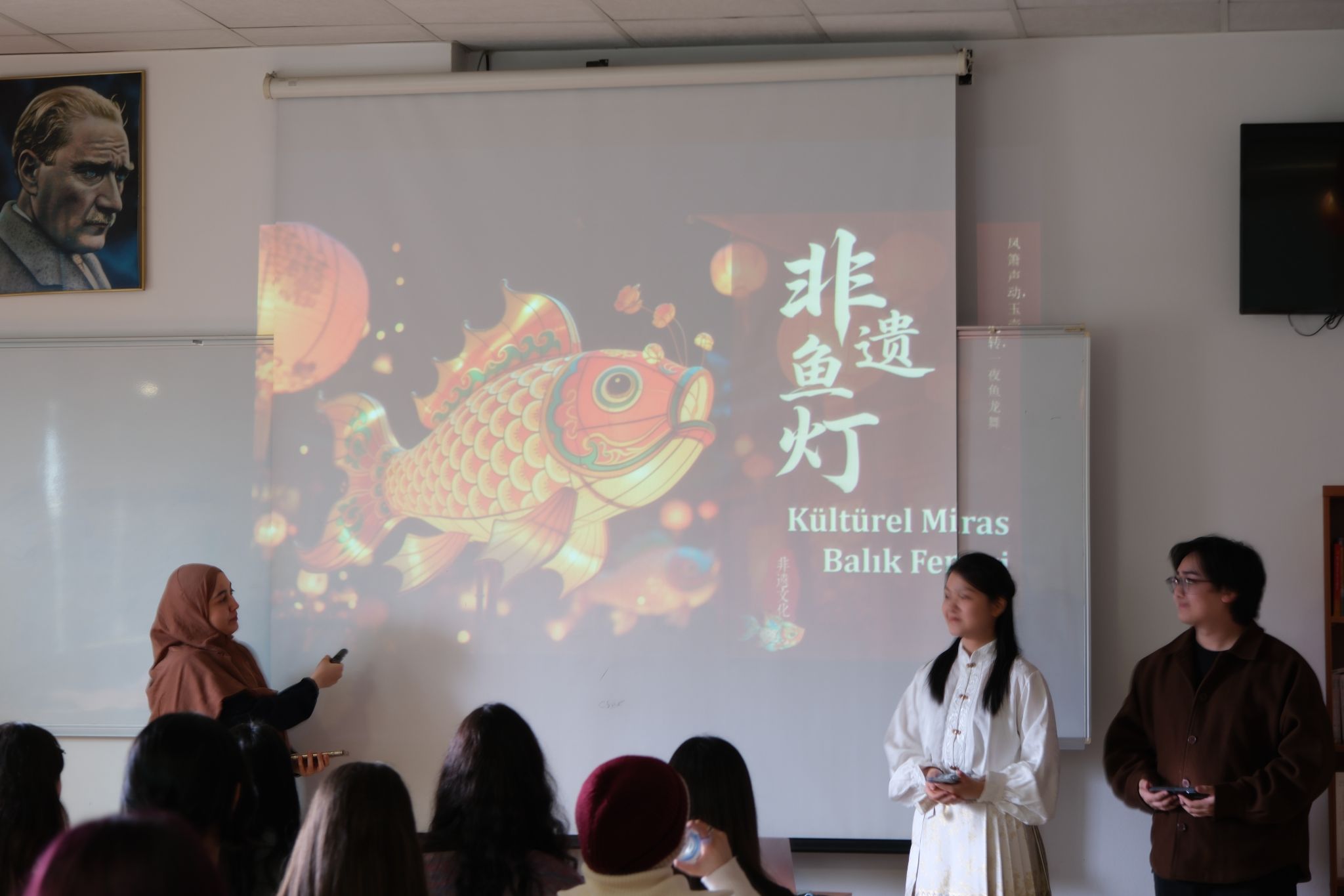 为了让讲解更加生动直观,学生们在准备阶段特意从小红书上搜集了大量优质资源——既有讲述鱼灯历史渊源的文化科普视频,也有各地鱼灯巡游的精彩瞬间,还有不少创意鱼灯的成品展示。这些来自中国社交平台的鲜活素材,被精心剪辑成短片,在课堂上逐一播放。这些来自小红书的“鱼灯宝藏”,让远在土耳其的学子们仿佛身临其境,也更直观地感受到了非遗技艺的魅力。
