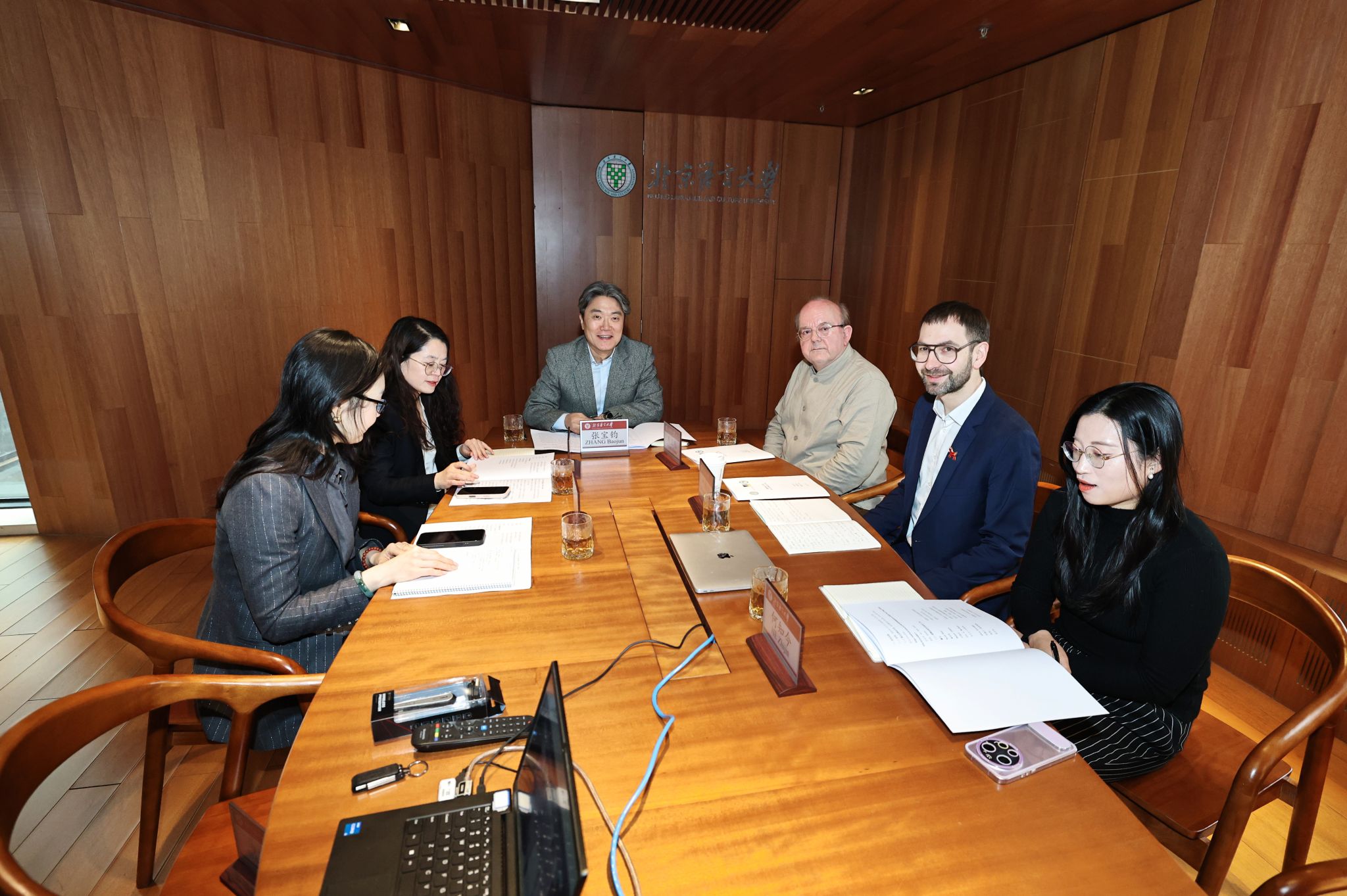 北语新闻网3月10日电(通讯员 赵默 摄影 魏达)3月4日下午,德国波恩孔子学院理事会理事长、波恩大学汉学系主任廉亚明教授(Ralph Kauz),德方执行院长叶翰识博士(Dr. Hannes Jedeck)访问我校,与德方副理事长乌尔夫·迈斯纳(Ulf. G. Meißner)、理事阿黛尔·施隆姆斯(Adele Schlombs )等相关理事会成员连线主持并召开了波恩孔子学院2026年度理事会。北京语言大学副校长张宝钧出席理事会,中方院长张道建、国际合作与交流处副处长苏文娟等孔院相关负责人员参加会议。