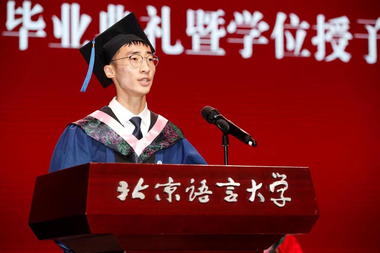 我是北京语言大学汉语国际教育学部2019级汉语国际教育专业硕士研究生王一凡。非常荣幸能够在这个庄严而隆重、充满温馨与感动的时刻,作为毕业生代表发言。