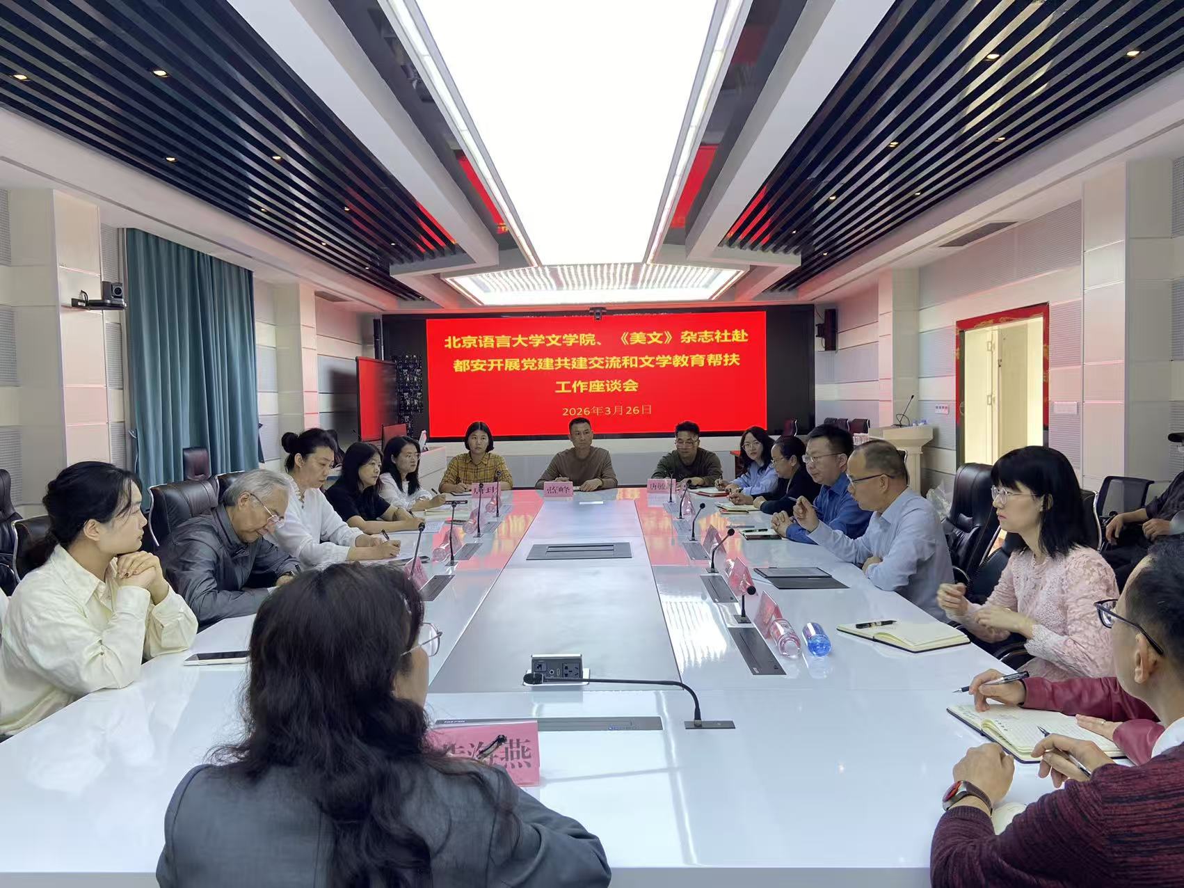 26日上午,在自治县教育局召开的党建共建交流和文学教育帮扶工作座谈会上,都安作家代表汇报了都安文学事业发展情况,分享了创作心得与发展思考。《美文》杂志社书记、常务副主编武梅介绍了《美文》办刊情况,分享优质文学刊物的办刊经验和创作导向。文学院党委书记闫冬介绍了北京语言大学文学院的学科优势、人才培养及党建工作特色,并表示将以党建共建为纽带,充分发挥学科优势与人才优势,深化与都安的文学教育帮扶工作,通过搭建交流平台、推动优质资源共享等方式,加强双方文学创作交流与合作。县教育局局长审国颂表示,将以此次文学教育帮扶为契机,加强与北京语言大学文学院、《美文》杂志社的沟通对接,将优质的文学资源转化为实际的教育成果,让都安文学之花在乡村振兴的沃土上绽放得更加绚丽。与会人员围绕创作实践、刊物合作、人才培养、文学普及等方面进行了深入交流。