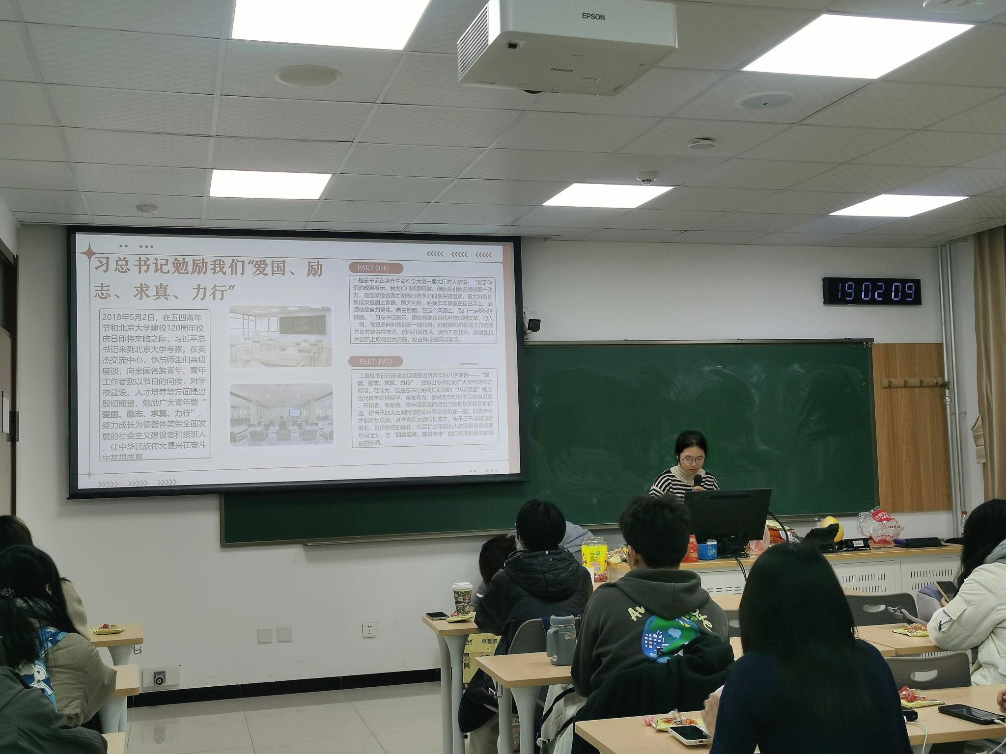 接着同学们共同深入学习了习近平总书记2018年5月2日在北京大学师生座谈会上的重要讲话。“爱国、励志、求真、力行”八字箴言让同学们受益匪浅。王逸晨同学说,今后要更踏实学习、认真做事,把这八个字落实到日常行动中,努力成长为有担当的新时代青年,为国家发展尽一份力。陶锴同学和罗柏源同学表示,在接下来的学习与生活中,他们将始终铭记“不忘初心”“砥砺前行”的准则,把理想落实在行动中,争做有理想、敢担当、能吃苦、肯奋斗的新时代好青年。