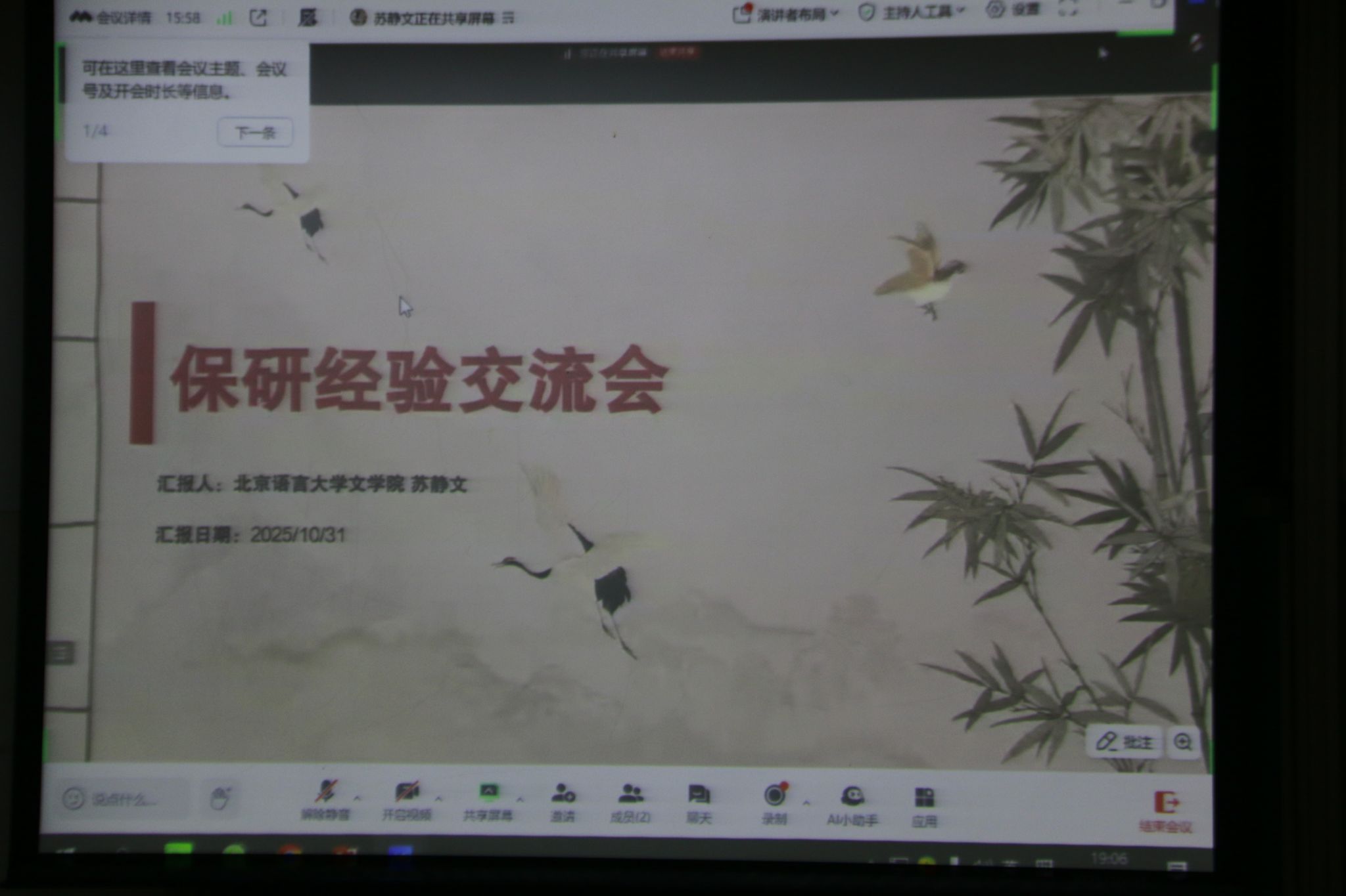 首先,两位同学通过线上连线的方式进行了经验分享。苏静文同学提醒同学们要尽早明确发展方向,做好充分准备。在材料整理环节,要细致了解各院校要求,做到分门别类、有的放矢。同时,面对时间冲突等问题,她建议同学们理性权衡、合理取舍,做出最适合自己的选择。